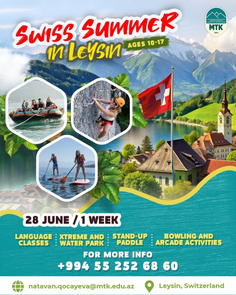 Swiss Summer Camp 2026 proqramı şagirdlərimizə İsveçrədə həm akademik, həm də sosial baxımdan zəngin beynəlxalq yay təcrübəsi təqdim edir. Proqram 28 iyun tarixindən etibarən 1 həftə davam edəcək.